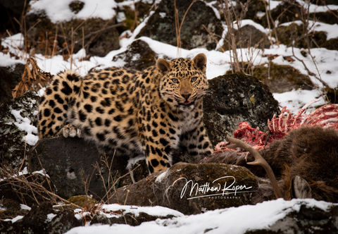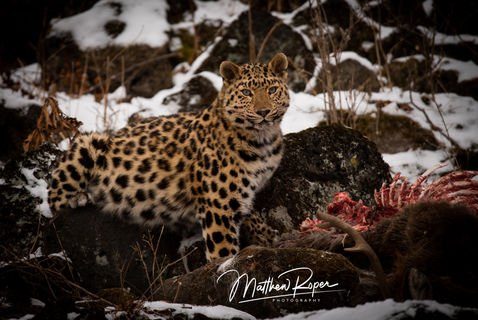 Amazingly, our work was rewarded early: after only a short time waiting, we saw a huge golden beast gliding down the hillside in front of us. She moved like a ghost, silent and stealthy as she nervously approached the deer carcass laid out in front of the hide. Lesley and I were careful not to startle her with any movement or camera clicks; we very carefully moved our lenses in the leopard’s direction only when she had her head down and was eating. The snow fell gently around her as she crunched on the deer bones, creating a perfect scene.